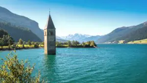 Il Lago di Resia nasce come bacino artificiale, costruito intorno al 1930 con lo scopo di utilizzarlo nella produzione di energia idroelettrica, sfruttando la presenza di due piccoli laghi circostanti. Il famoso campanile che si vede spuntare appartiene all’antica chiesa di Curon, la cui cittadina fu completamente sommersa.