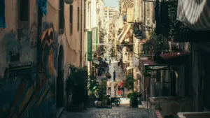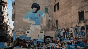 Attraversiamo i Quartieri Spagnoli, un intreccio di vicoli vibranti e identità fortissime, con tappa al simbolico tempio di Maradona, icona di fede laica e passione collettiva.